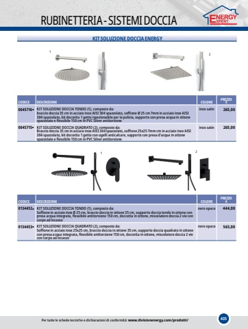 435RUBINETTERIA - SISTEMI DOCCIAKIT SOLUZIONE DOCCIA ENERGY21CODICEDESCRIZIONECOLOREPREZZO%u20ac0045716%u25cfKIT SOLUZIONE DOCCIA TONDO (1), composto da:braccio doccia 35 cm in acciaio inox AISI 304 spazzolato, soffione %u00d8 25 cm 7mm in acciaio inox AISI 304 spazzolato, kit doccetta 1 getto ispezionabile per la pulizia, supporto con presa acqua in ottone spazzolato e flessibile 150 cm in PVC Silver antitorsioneinox satin265,000045715%u25cfKIT SOLUZIONE DOCCIA QUADRATO (2), composto da:Braccio doccia 35 cm in acciaio inox AISI 304 spazzolato, soffione 25x25 7mm cm in acciaio inox AISI 304 spazzolato, kit doccetta 1 getto con ugelli anticalcare, supporto con presa d%u2019acqua in ottone spazzolato e flessibile 150 cm in PVC Silver antitorsioneinox satin265,0021CODICEDESCRIZIONECOLOREPREZZO%u20ac0134452%u25cfKIT SOLUZIONE DOCCIA TONDO (1), composto da:Soffione in acciaio inox %u00d8 25 cm, braccio doccia in ottone 35 cm, supporto doccia tondo in ottone con presa acqua integrata, flessibile antitorsione 150 cm, doccetta in ottone, miscelatore doccia 2 vie con corpo ad incassonero opaco444,000134453%u25cfKIT SOLUZIONE DOCCIA QUADRATO (2), composto da:Soffione in acciaio inox 25x25 cm, braccio doccia in ottone 35 cm, supporto doccia quadrato in ottone con presa acqua integrata, flessibile antitorsione 150 cm, doccetta in ottone, miscelatore doccia 2 vie con corpo ad incassonero opaco563,00Per tutte le schede tecniche e dichiarazioni di conformit%u00e0: www.divisionenergy.com/prodotti/